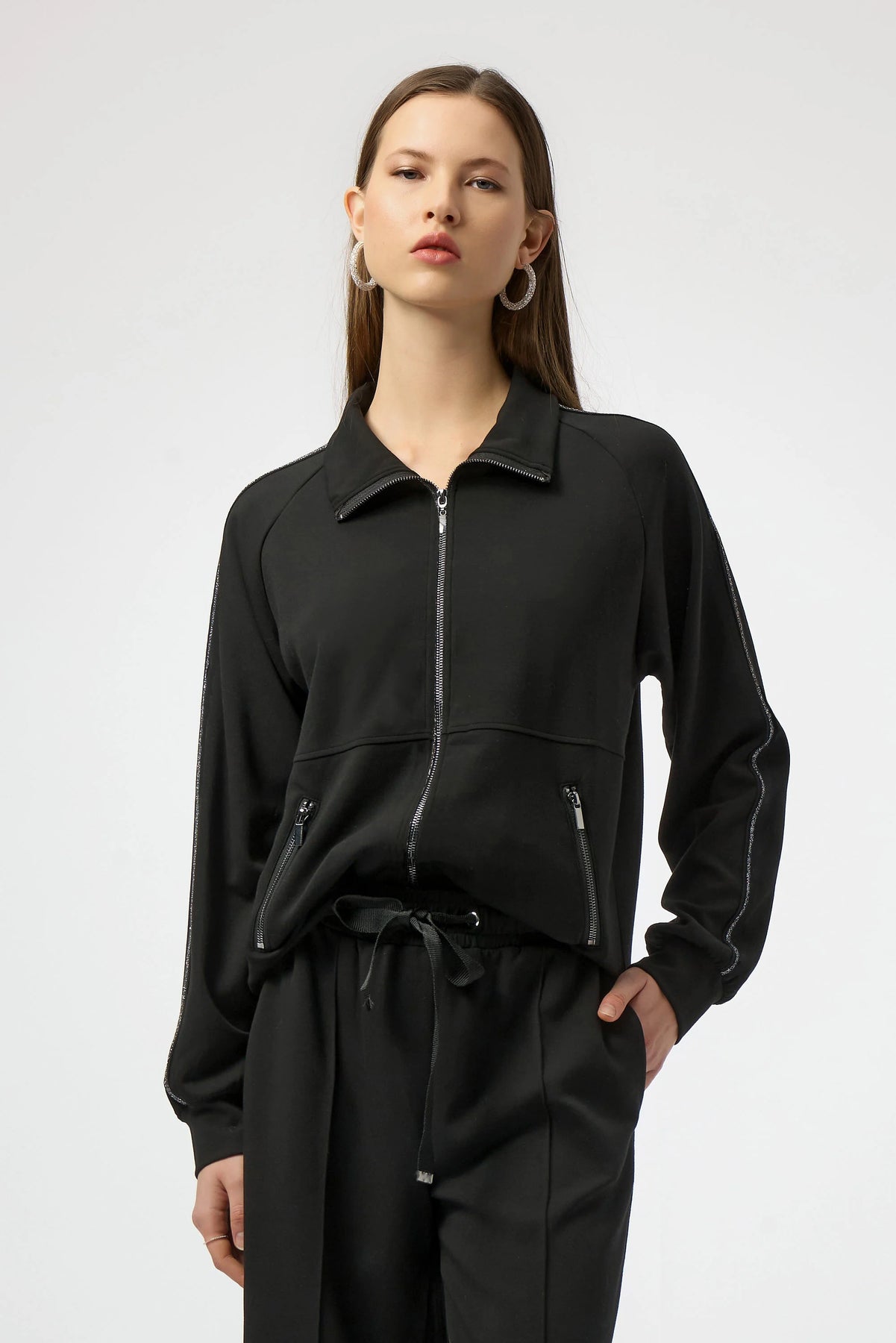 Crafted from ultra-soft scuba knit, this zip-front jacket features a cozy funnel collar with a drawstring and a chic cocoon silhouette for effortless comfort. A subtle metallic trim adds a touch of glamour, elevating its relaxed appeal.