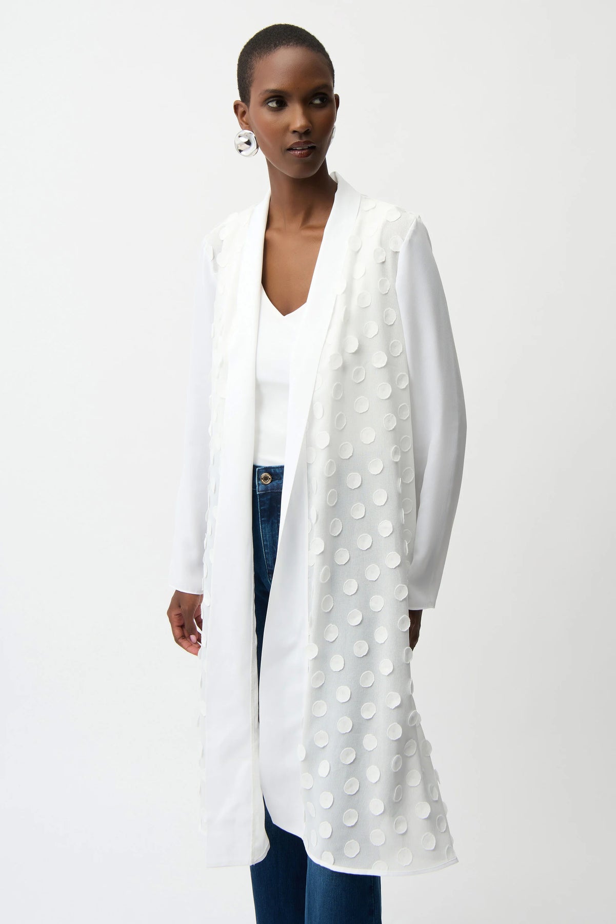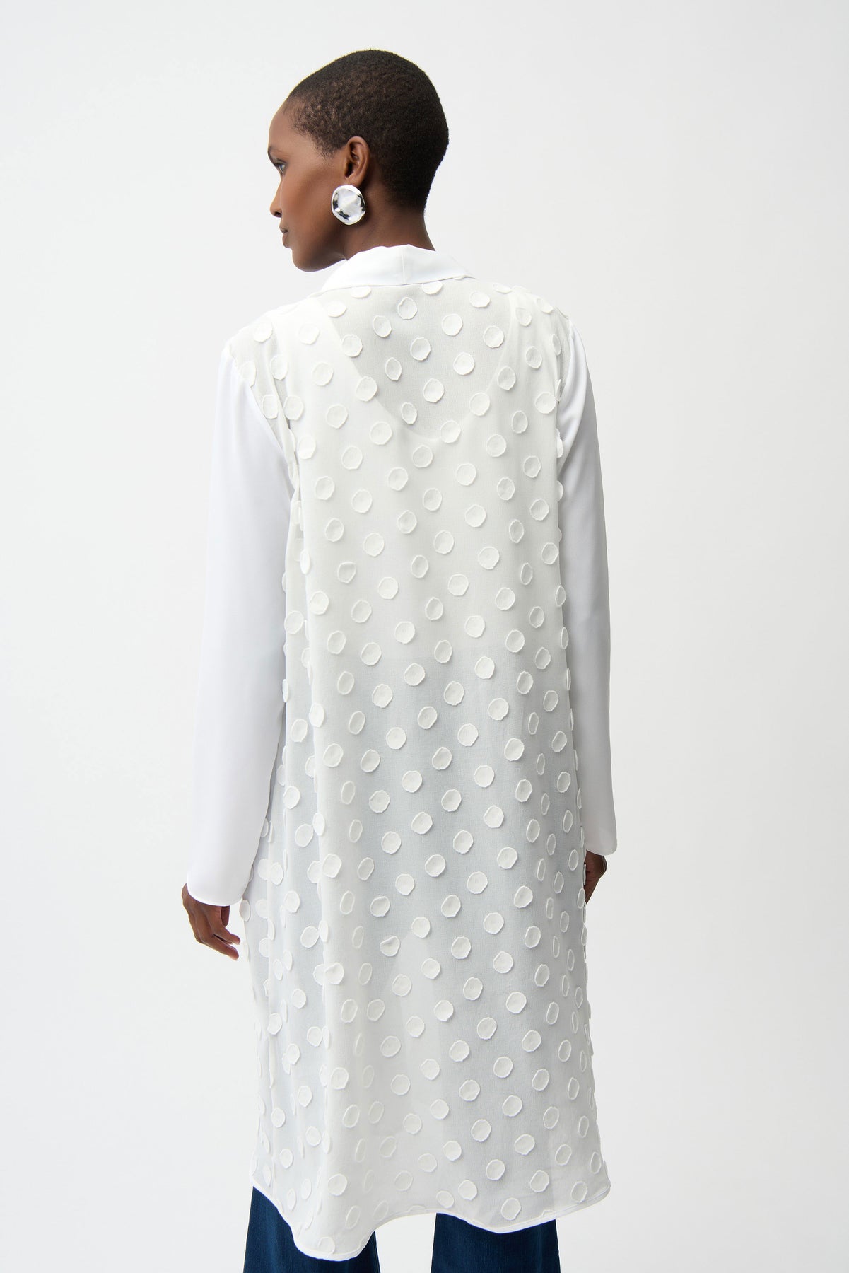 Textured and lightweight, this A-line cover-up is crafted from 3D dot novelty fabric and finished with sheer georgette long sleeves and a clean neckline band for an elegant layering piece.