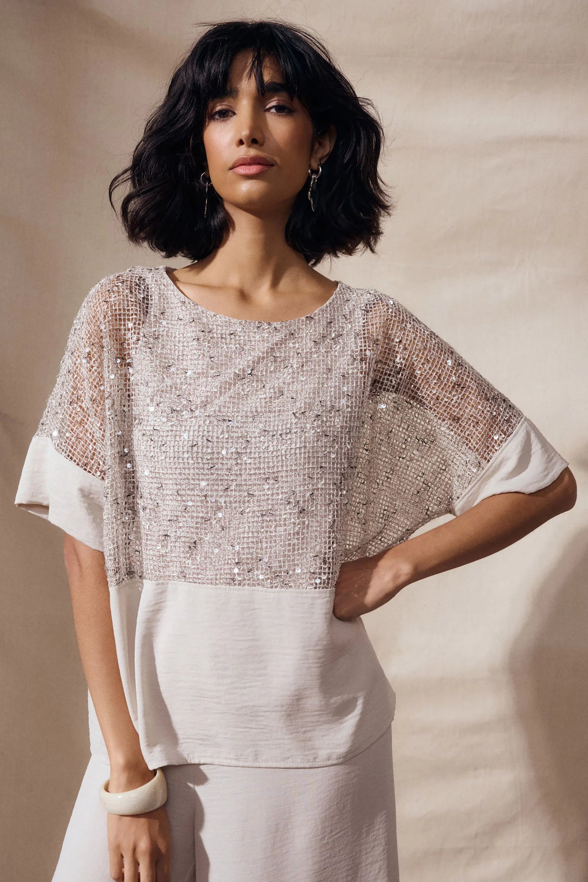 This boxy top blends gauze and sequined novelty fabric for a hint of shimmer. Designed with short dolman sleeves and an attached under-cami for easy coverage, it’s fully lined for a refined, smooth finish.