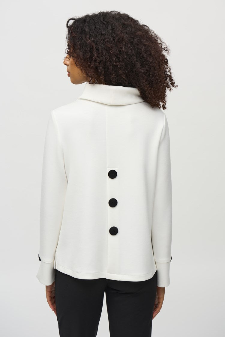 Embrace effortless style in this scuba jersey top. This contemporary piece is designed in a bold boxy silhouette with a sleek cowl collar and long sleeves with subtle slits at the cuffs for extra flair. The long slit at the back of the garment and contrasting buttons lend the top its unique appeal.